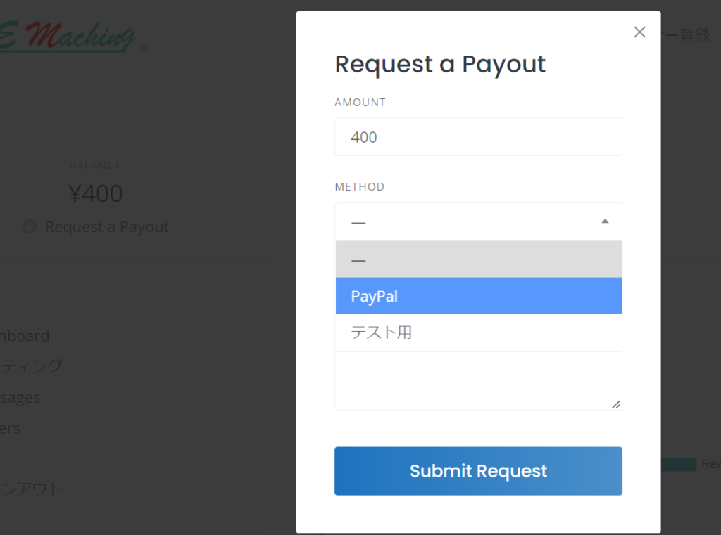 Request a Payoutより、出品者は売上金の申請を行う事が出来ます。