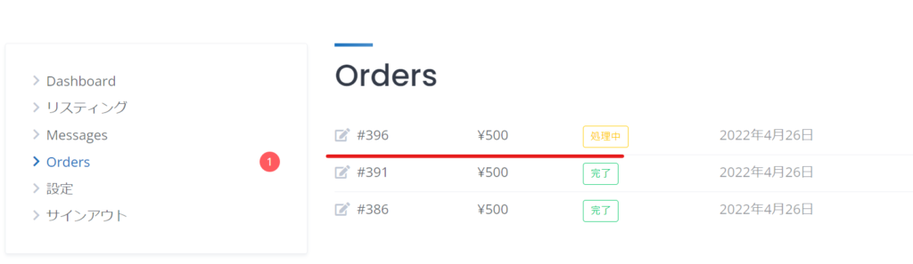 Ordersの中に【処理中】として新規注文が入ってきます。