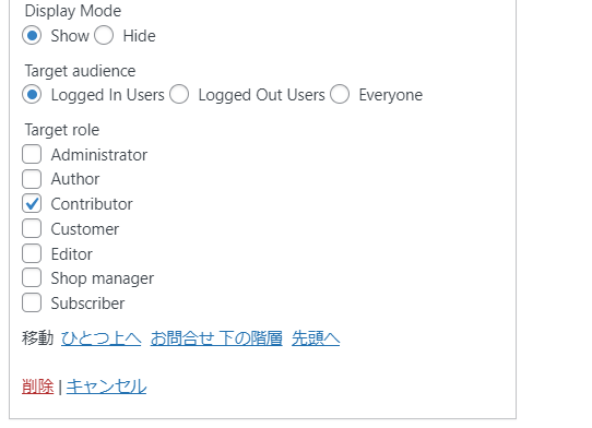 とWordPressの権限が異なっている事に触れましたが、この設定を利用して、WordPressユーザー権限でメニューバーの表示を分けます。つまり