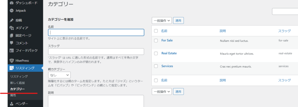 WordPressを使ったマッチングホームページの作り方プラグイン【HivePress】出品カテゴリー設定
