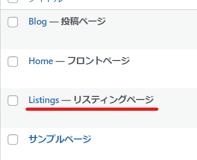 - リスティングページ ー リスティング一覧を表示させる固定ページを指定します