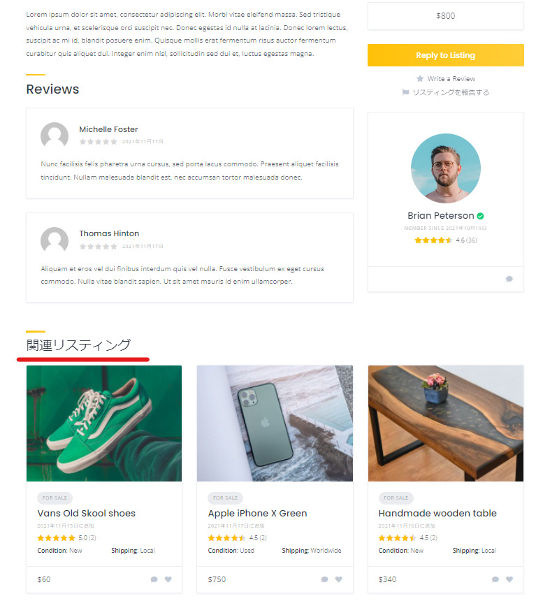 リスティング詳細ページの下部に関連リスティング項目があります。表示させる件数を設定できます。