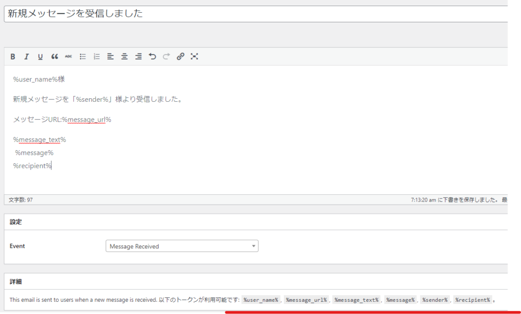 一度公開ボタンをクリックすると使えるメールプレースホルダー一覧が表示されるので、そのメールプレースホルダーを使ってメール文面を作成します。サンプルです