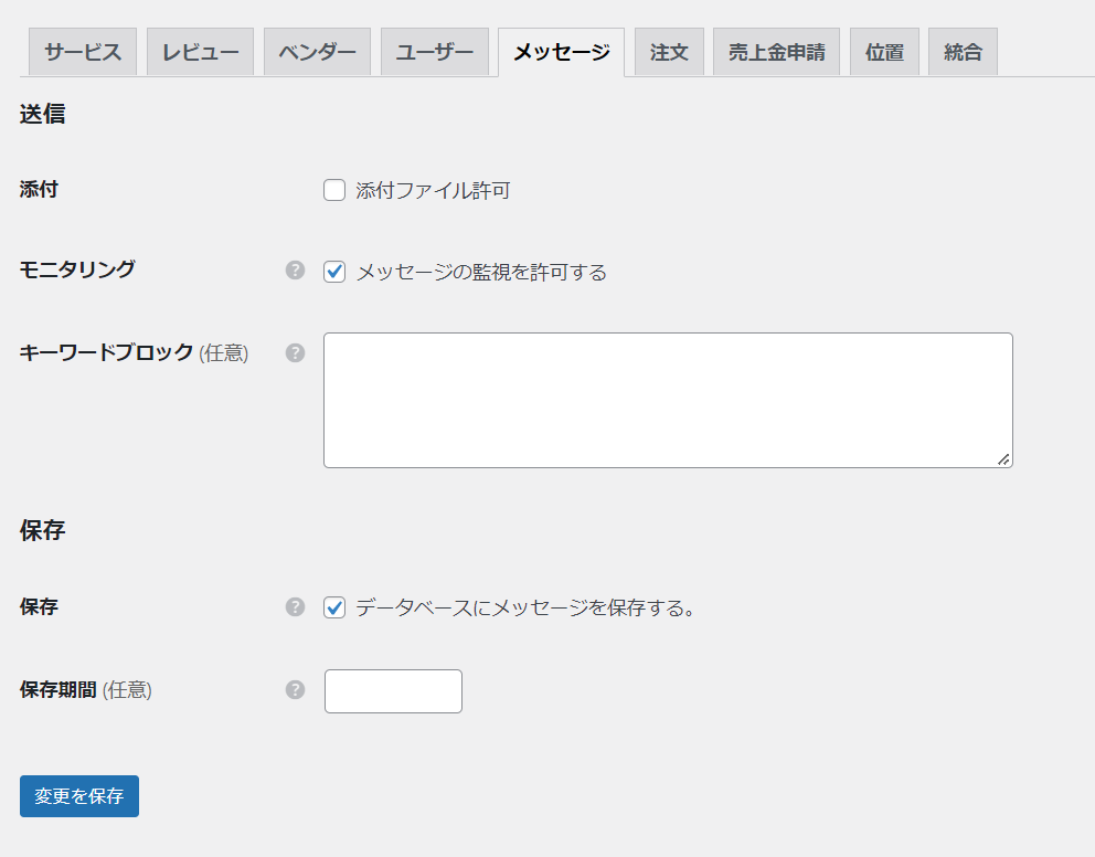 - Attachments - メッセージ機能で添付ファイルを有効化したい場合はチェックを入れます。有効化すると許可する添付ファイル形式を指定する事が出来ます。
