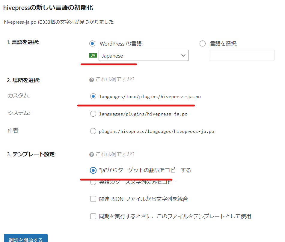 - テンプレート選択 ー 既に翻訳されている日本語は使いたい為、jaからの~にチェックを入れます