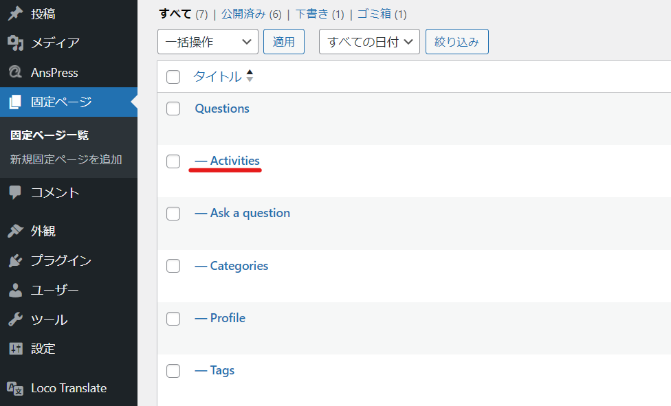 AnsPressプラグインをインストールしたときに自動生成される固定ページ「Activity」について説明をします。
