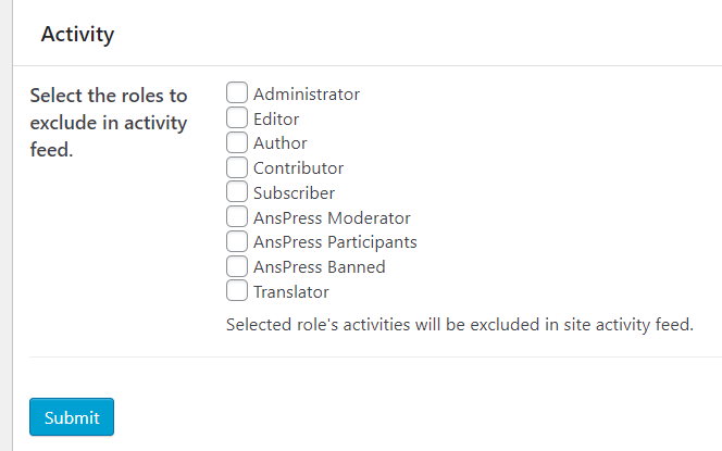 AnsPressのActivityページで自動表示されるユーザーの権限を制御できます。