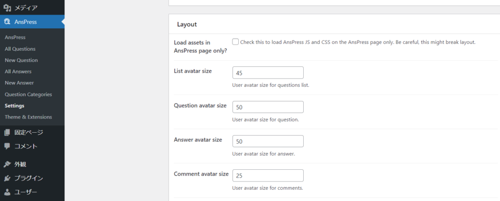 「Load assets in AnsPress page only?」はチェックを入れても入れなくてもどちらでも大丈夫です。チェックを入れるとAnsPressページにだけAnsPressのJSとCSSが読み込まれるのでサイトの表示速度改善につながりますが、サイトのレイアウトが崩れる場合もあります。