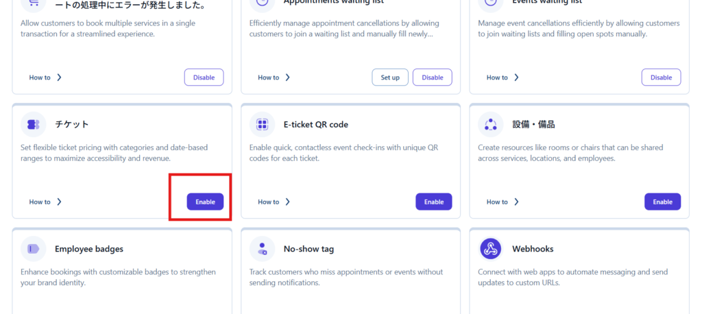 チケット機能はイベントで様々な価格設定が出来るようになる機能なので、Enableにするだけで使えるようになります。