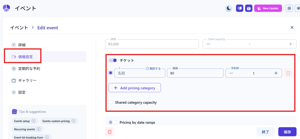 イベントの価格設定の中に、チケットの項目が追加されます。