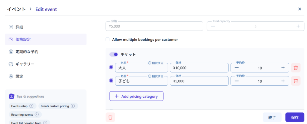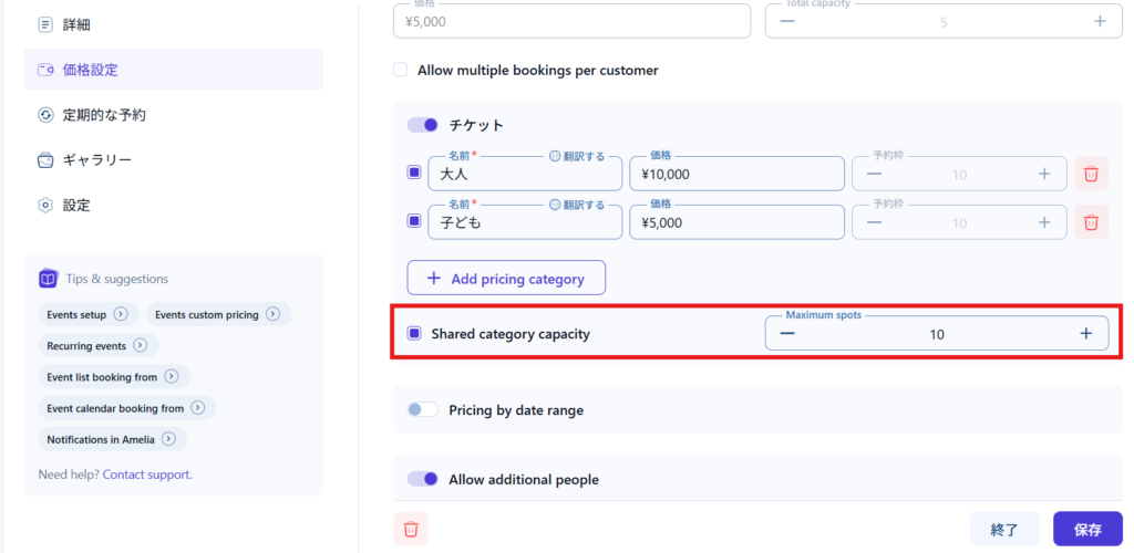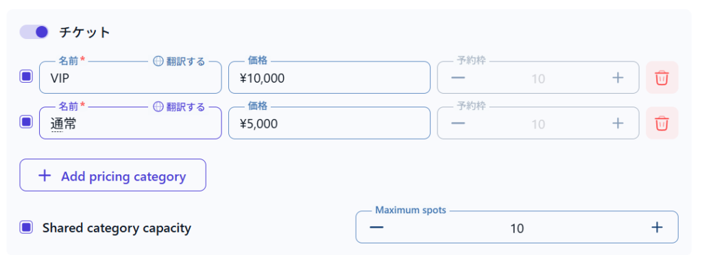 Shared category capacityをONにすると、先ほど設定した大人と子供合わせて何名まで予約が出来るか、追加しているカテゴリー合計の人数を予約人数として設定する事が出来ます。