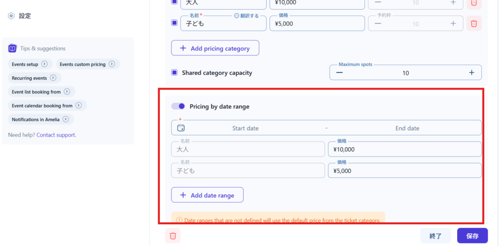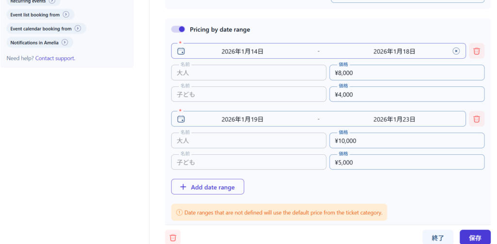チケットの下に、【Pricing by date range】という項目が追加され、予約日による価格の変動を設定する事が出来ます。