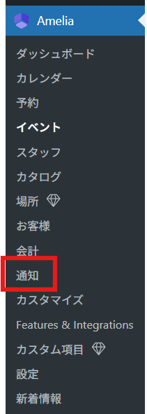 まずは、Amelia > 通知内に、顧客向けのメール設定が入っています。