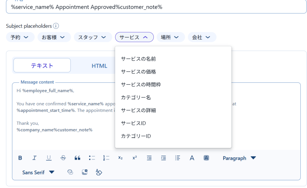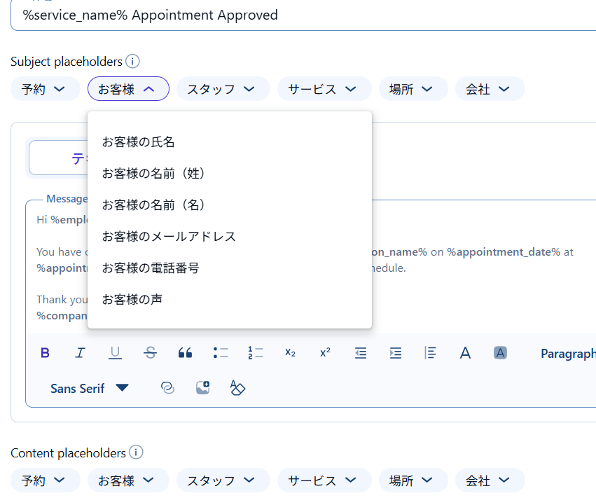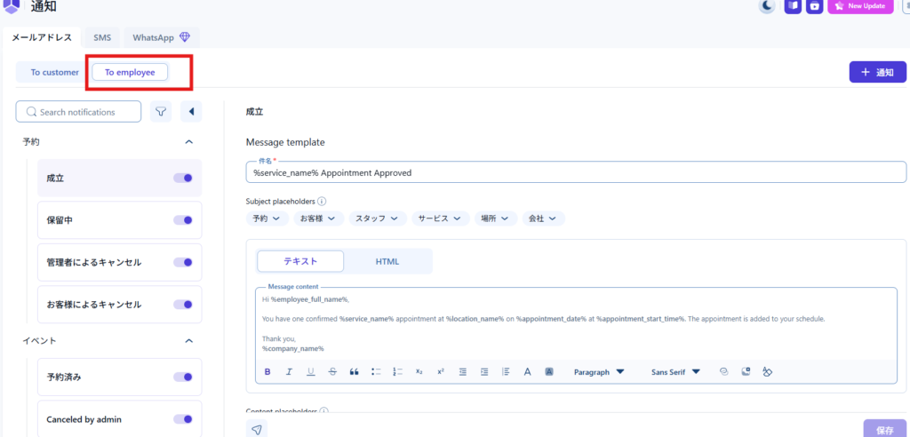 スタッフ向けにも顧客向けと同じタイミングでメールの設定が出来ます。