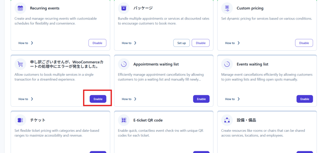 カート機能は1度に複数の予約が出来るようになる仕組みなので、設定はなくEnableにするだけで使えるようになります。