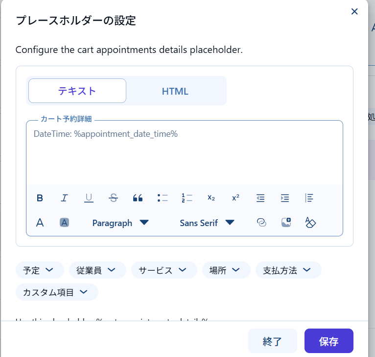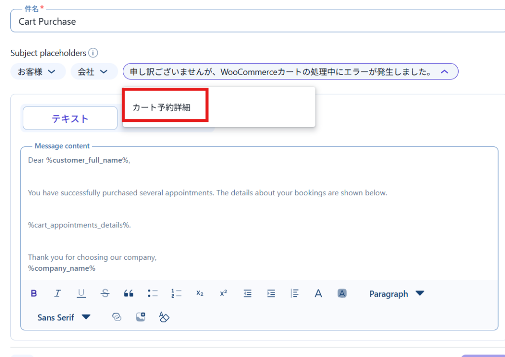 カートのプレースフォルダ内に何を含めるか、カートの予約詳細の設定でカスタマイズする事が出来ます。