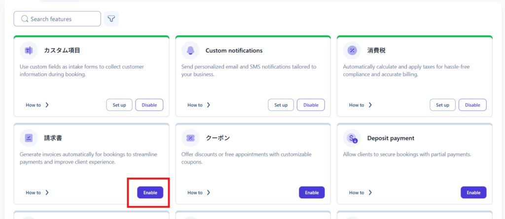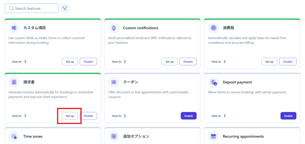 【Set up】をクリックすると、請求書を顧客に送付するかそうかの設定になります。デフォルトでOFFになっている為、請求書を送付したい場合は「デフォルトでお客様に請求書を送る」をONにします。