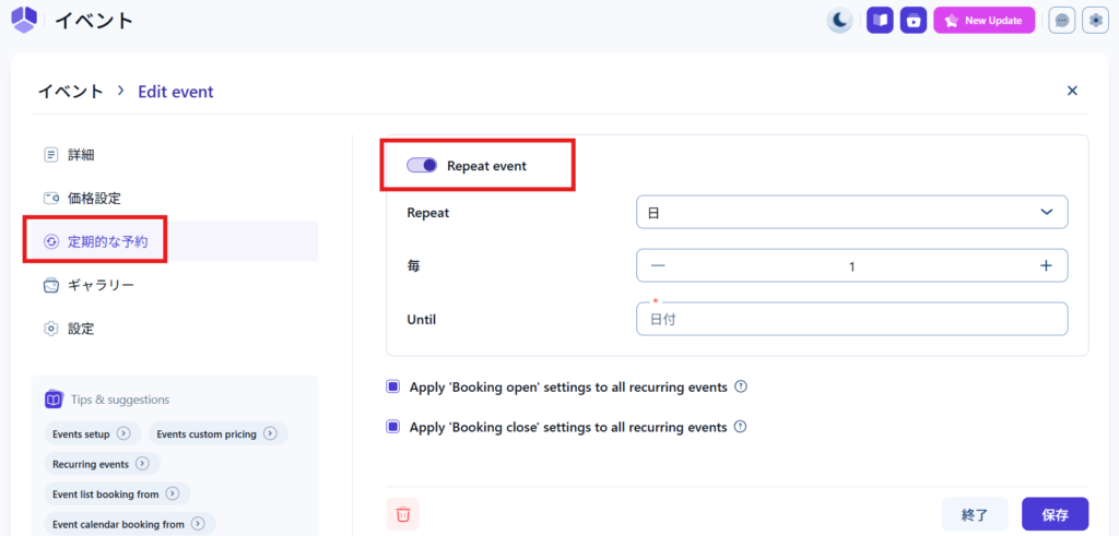 Recurring events機能をONにするとイベントの設定箇所に【定期的な予約】という項目が追加されます。