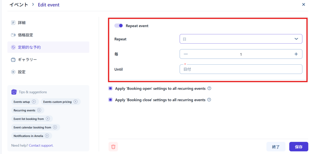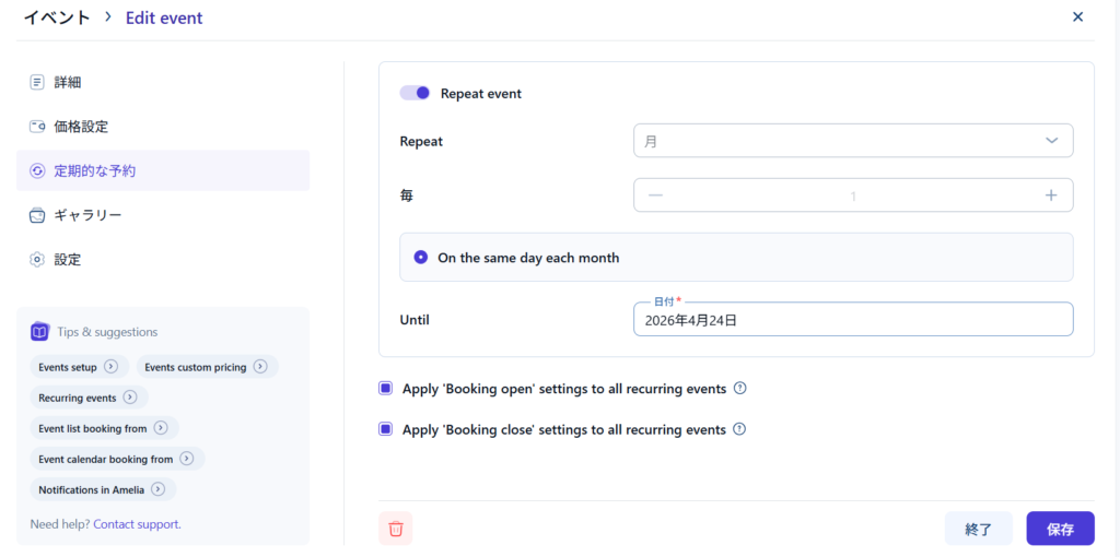 WordPress予約システムプラグインAmelia 有料版 イベントの定期予約の設定を解説(9.x以降)