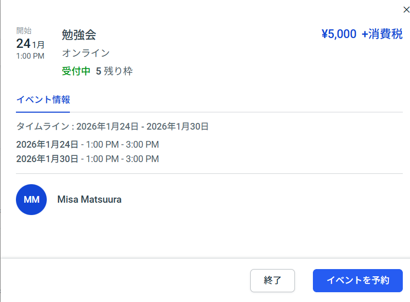 - Apply ‘Booking open’ settings to all recurring events ー イベントの予約開始に関しての設定。ONにすると最初のイベントに設定されたロジックが後の予定にも反映されます。