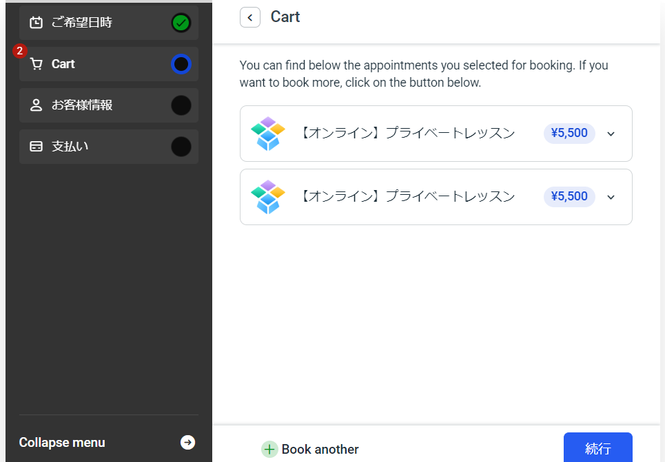 Cartという項目が追加され、「Booking another」で2個目の予約を追加する事が出来ます。