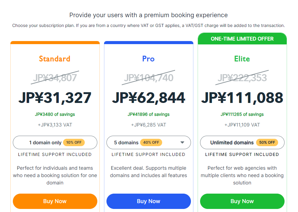 事業者の方であれば、Lifetimeプランを購入される方がお得かなと思います。1~2回の予約システム単体導入でライセンス購入費は回収可能だと思いますので、初期投資だと思います