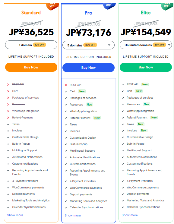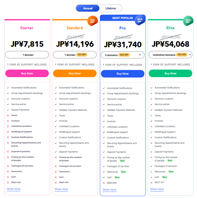 事業者の方であれば、Lifetimeプランを購入される方がお得かなと思います。1~2回の予約システム単体導入でライセンス購入費は回収可能だと思いますので、初期投資だと思います