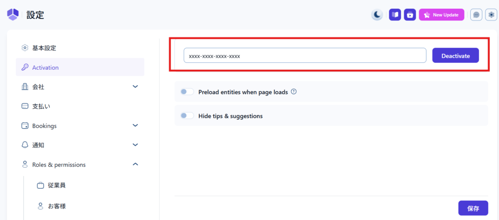 メールで送られてきたライセンスは【設定】>【Activation】へ入力をしておくことで、有料版の機能が有効化されます。