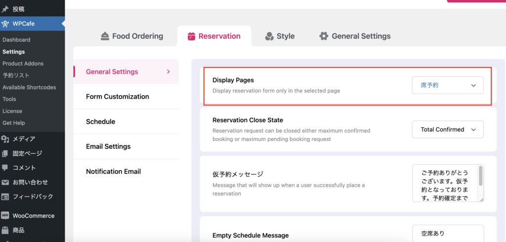 【WP Cafe】プラグインで席予約システムを構築。任意の固定ページを指定する方法を解説。無料版の方はショートコードで席予約フォームを固定ページに出力することができます。