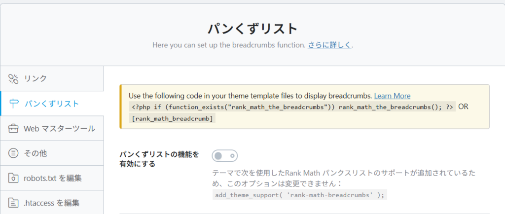 この設定をONにすると、RankMathのパンくずリスト機能が利用可能になります。