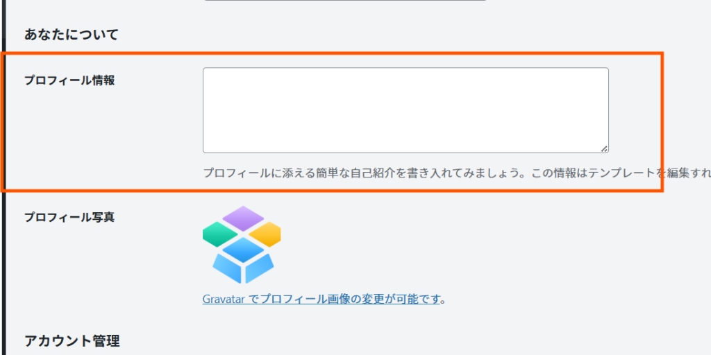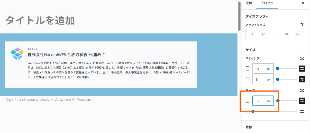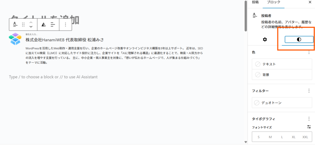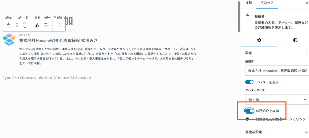 デフォルトではプロフィールの表示がOFFになっているので、投稿ブロックを選択した後、右サイドバーのブロックにて、「自己紹介を表示」をONにします。