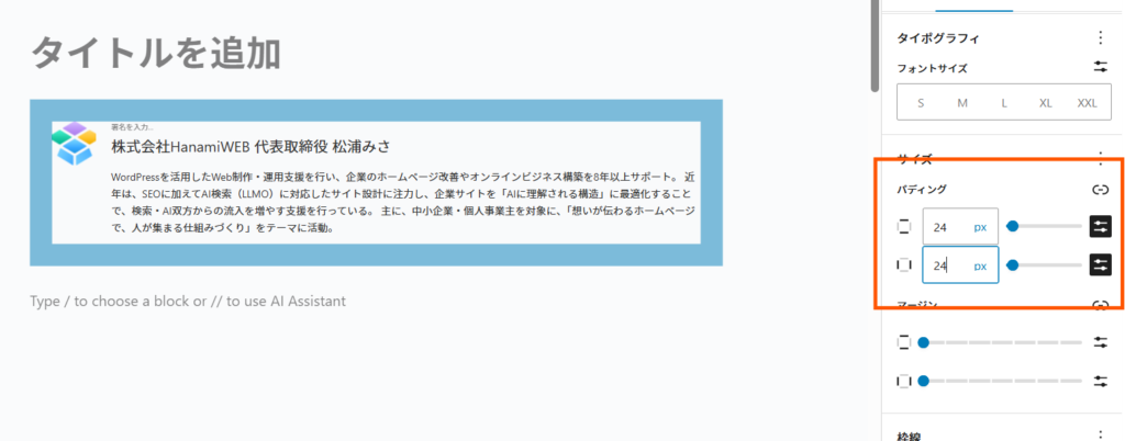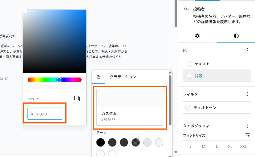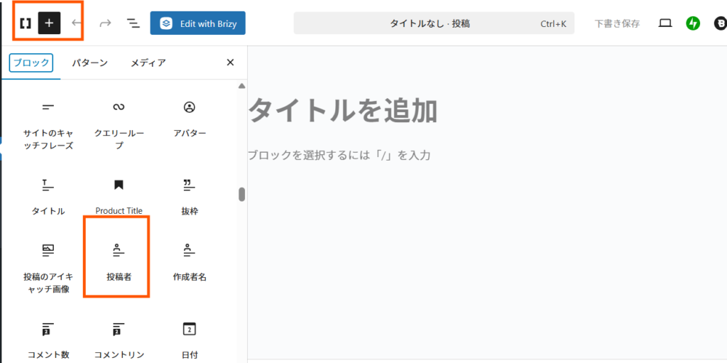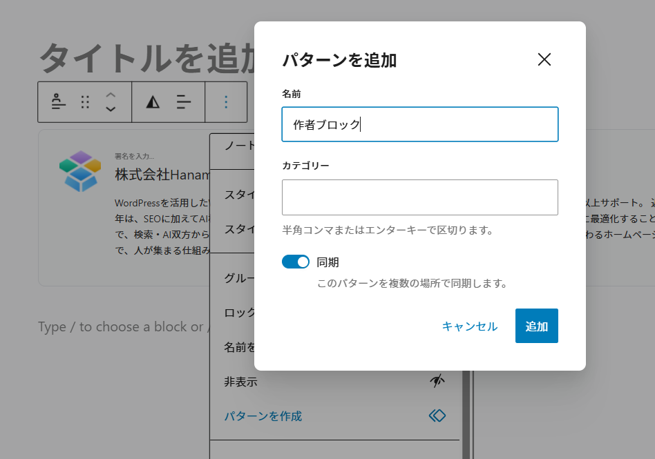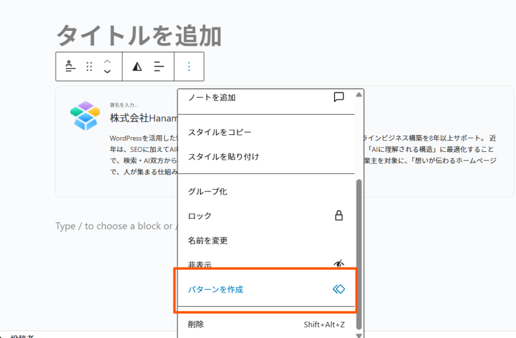 今作った投稿者ブロックのデザインを含めて「パターンを作成」に登録しておきます。