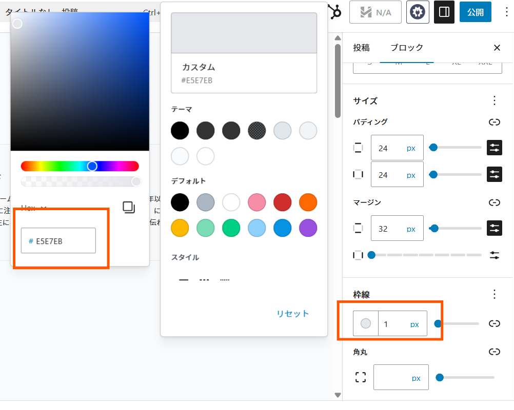 添付のカスタムという部分をクリックすると色コードを入力する画面が出力されるので、希望の色番号を入力します。