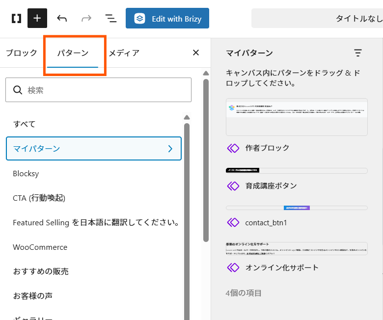 パターンはブロックディタ内の「パターン」タブに保存されます。