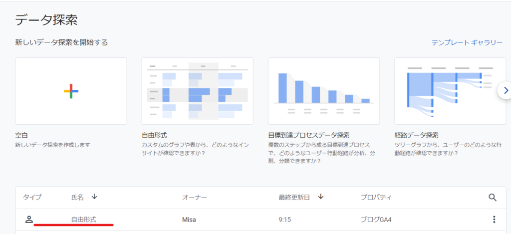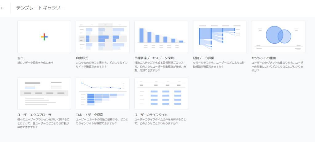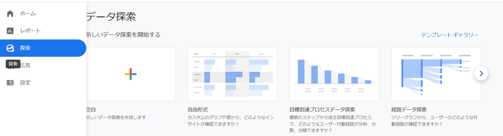 アナリティクスへログインをした後、左サイドバーの【探索】をクリックしてみてください。
