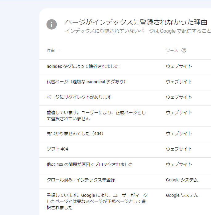 ぞの下に「ページがインデックスに登録されなかった理由」という感知されていない箇所のリストがあります。