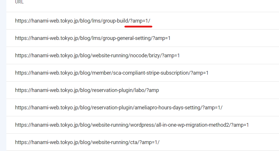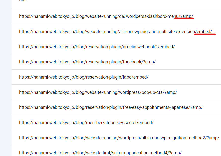 当サイトの場合、ampやembedページがこのようにリストアップされていました。問題ないのでこのままの状態で大丈夫です。