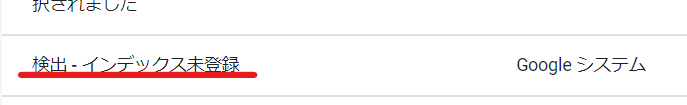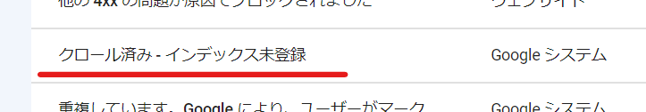 クロール済み - インデックス未登録という箇所です。クロール済みとは、検索エンジンが巡回をしたけれどもインデックス(検索エンジンリスト)に登録されていないという意味です。
