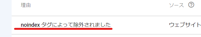 「ページがインデックスに登録されなかった理由」という箇所に「noindexタグによって除外されました」という箇所があります。クリックをするとURLの一覧が表示されます。