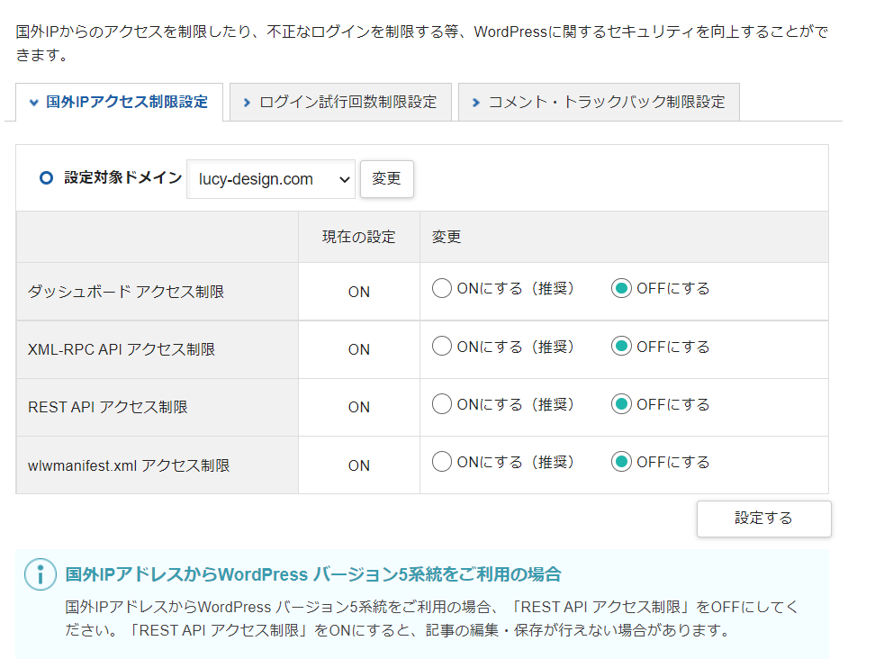 - サーバーで海外からのWordPressダッシュボードアクセス制限をOFFにする