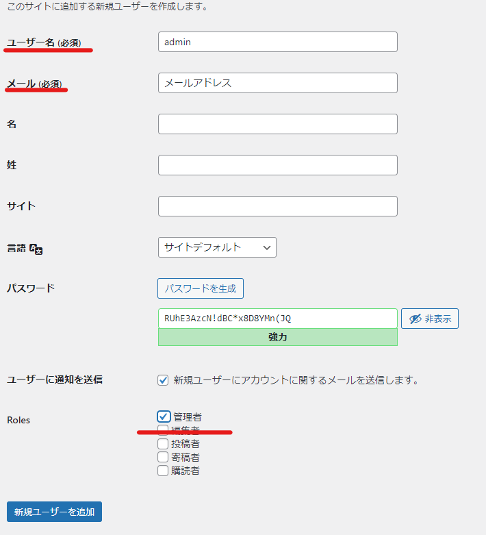 WordPress管理者権限でのユーザーを新規作成