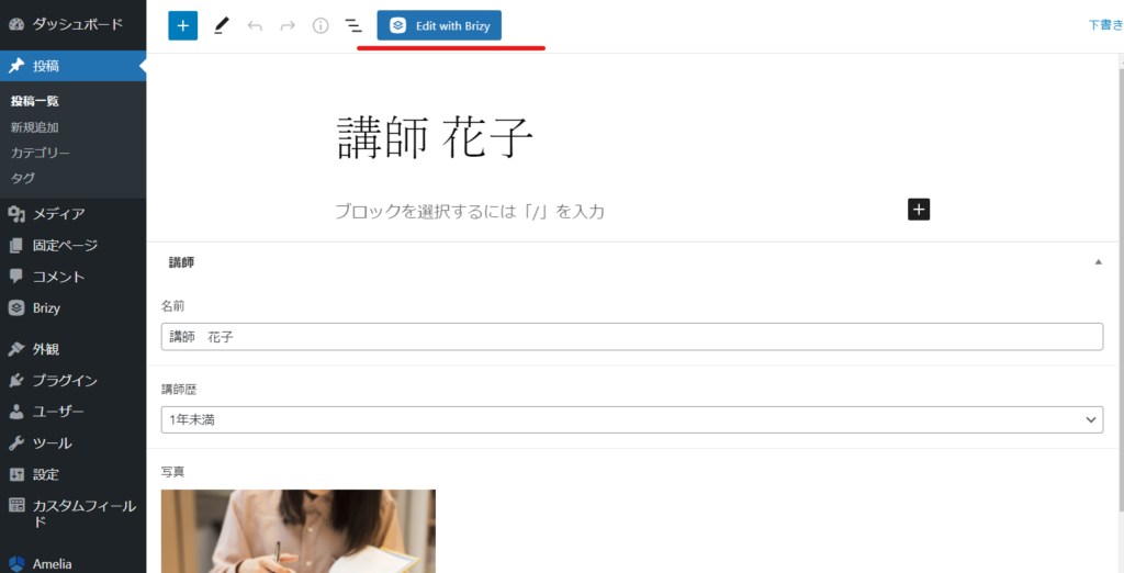 先ほどカスタムフィールドを入力したページを再度開き、【Edit with Brizy】ボタンをクリックします。