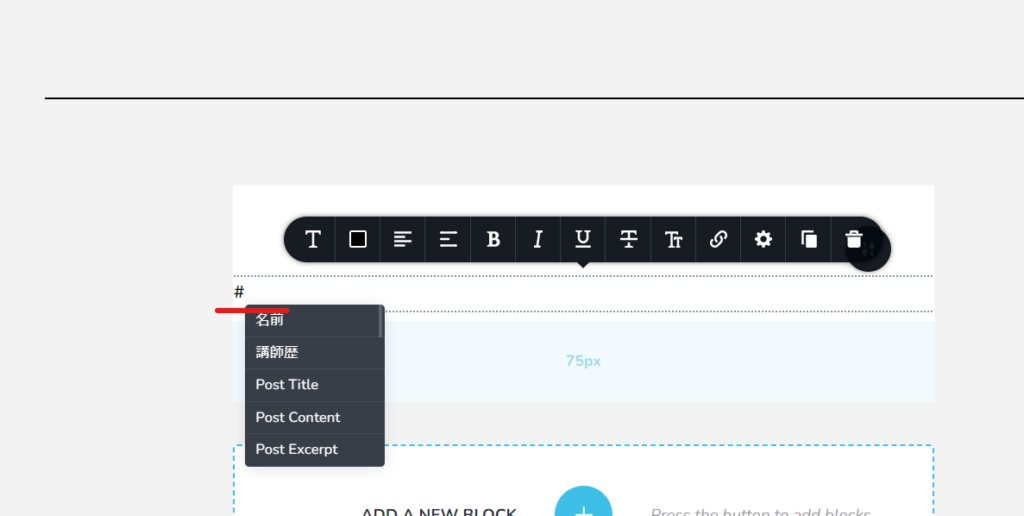 半角の【#】を入力すると、先ほど作成したCustom Field名が出てくるので、選択をします。