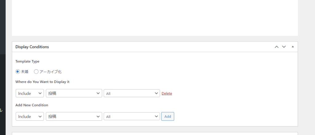これから作成するテンプレートがどのページのテンプレートにするのか設定します。今回はブログ全部という想定なので、