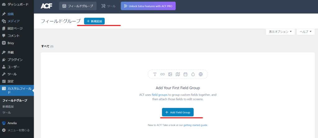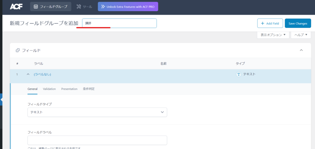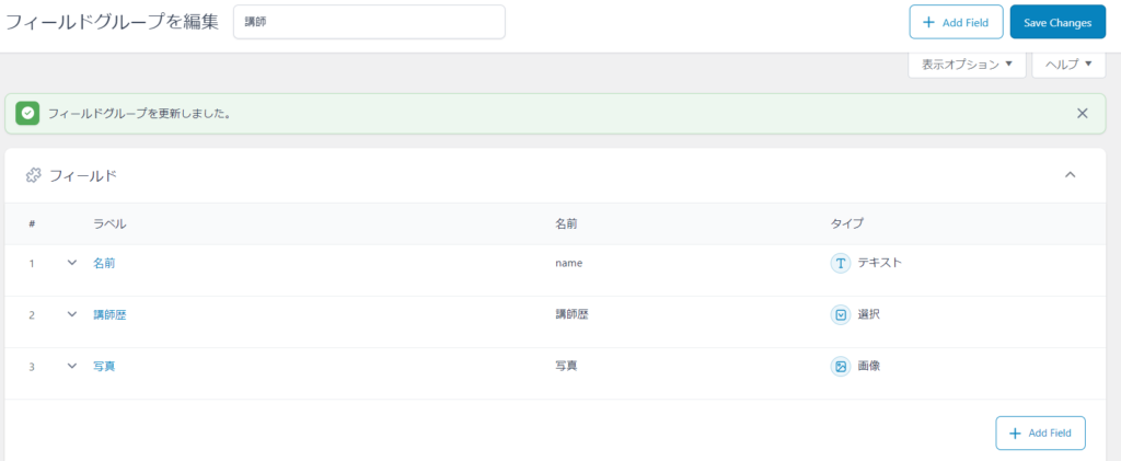 プラグインを有効化すると左に「カスタムフィールド」という項目が追加されます。