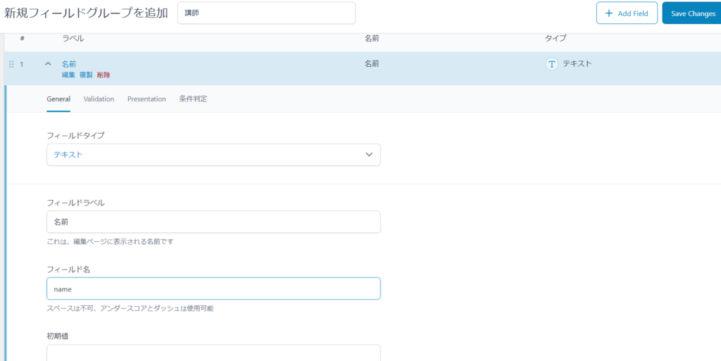 名前を付けたら、カスタムフィールド項目を作成していきます。
