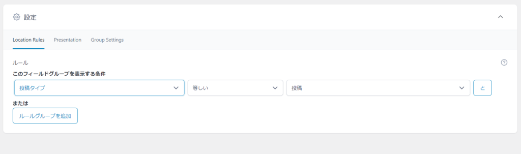 作ったフィールドをどのページで使うのか設定をします。今回はブログの投稿に出力させます。
