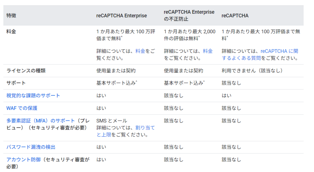 となっています。「reCAPTCHA Enterpriseの不正防止」以外は1ヶ月100万件評価まで無料なので、一般的には料金が発生する事は無いと思います。