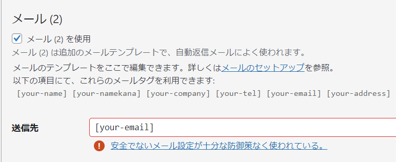 メール設定でメール(2)の送信先にはお客様が入力したメールアドレスを出力する変数がデフォルトで入ってくると思いますが、「安全ではないメール設定が十分な防御策なく使われている。」というエラー表示が出ます。