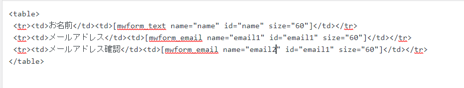 <tr><td>メールアドレス確認</td><td>[mwform_email name="email2" id="email1" size="60"]</td></tr>